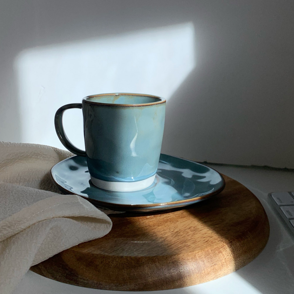 كوب أحمر فاخر مع صحن برسومات مُزهرة