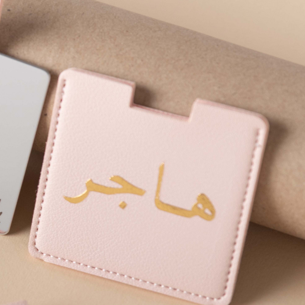 5 مرايا بمحافظ جلدية فاخرة ، بإضافة اسم على المحفظة باللون الذهبي الأنيق